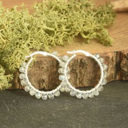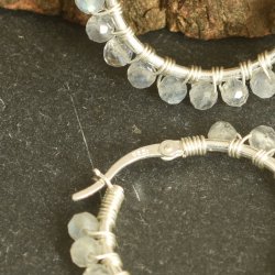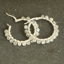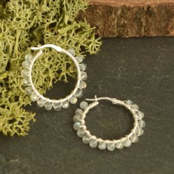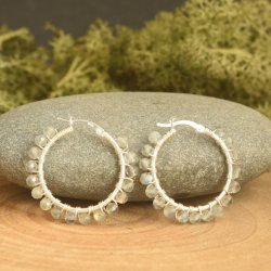 Handcrafted labradorite hoop earrings, delicately handwrapped in recycled sterling silver for a unique, nature-inspired touch.