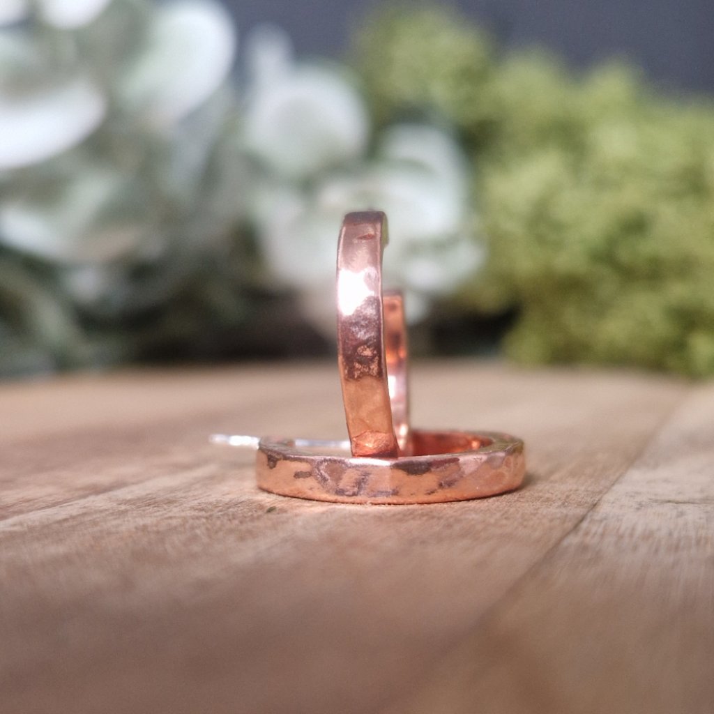 Handmade hammered copper hoops with sterling silver posts—small, rustic, and perfect for everyday wear.