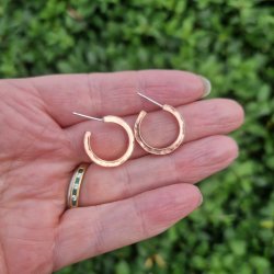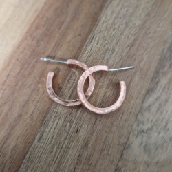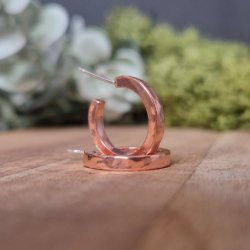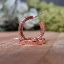 Handcrafted from solid 99.9% pure copper with sterling silver posts, these small hammered hoop earrings bring rustic character to a classic design. Each tiny 13mm hoop is shaped, textured, and polished by hand for a warm, organic shimmer that makes them perfect for everyday wear.